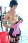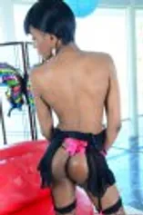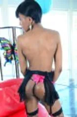 Black Trans plays with her cock while in dressed fishnets.