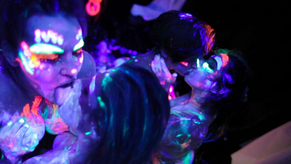 A quartet of gorgeous young lesbians -- Abella Danger, Dana DeArmond, Karlee Grey and Jada Stevens -- has a kinky party in the dark, decorating each other's nude body with luminescent paint. Faces, tits and asses gleaming with color, these fun-loving sluts get messy, licking butt cracks, sucking feet, gagging on huge dildos and fucking each other with strap-ons! Smeared in a cool alien glow, the partying girlfriends bring themselves and one another to climax using skilled tongues, fingers, vibrators and toys.